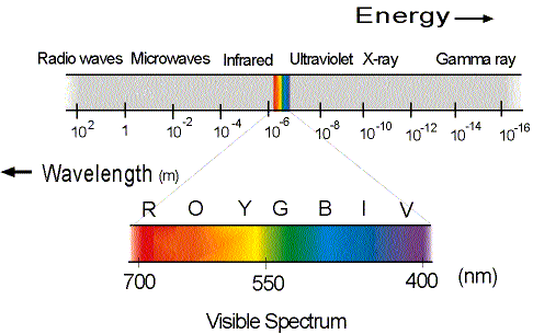 The wavelengths (or equivalently, frequencies) of EM radiation are broken up into various regions, none of which are precisely defined. The two broadest categories are visible and nonvisble light. (By visible, we mean, of course, visible by the human eye.) The various wavelengths (or frequencies) of EM waves form what is called the electromagnetic spectrum. The visible region of the electromagnetic spectrum normally extends from about 390 nm to about 780 nm. (Recall that a nanometer, nm is equal to 1 nm = 1 x 10 9 m.) For simplicity, we will take the visible region of the EM spectrum to be from about 400 nm = 4.0 x 10 7 m (violet light) up to about 700 nm = 7.0 x 10 7 m (red light). Again, these wavelengths are not precisely defined in that light that is 640 nm may also look red to you. Where the light stops looking red and starts look orange can vary from person to person. (Some people have reportedly been able to see light with wavelengths as small as 310 nm or as large as 1050 nm! See the table below for accepted values of the wavelength ranges for the various colors in the visible spectrum.)